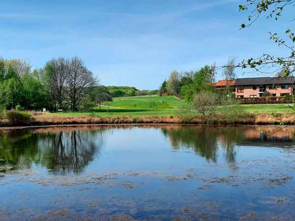 Følg trampestien rundt om søen hen til madpakkehuset. Fortsæt bagom madpakkehuset, ned til bækken, ad den nye bro over til sportspladsen.