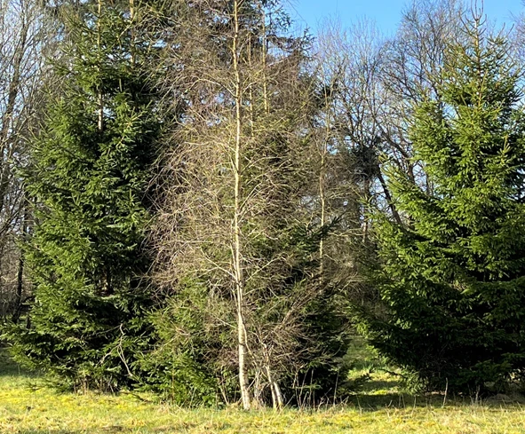 Du passerer også disse store grantræer: