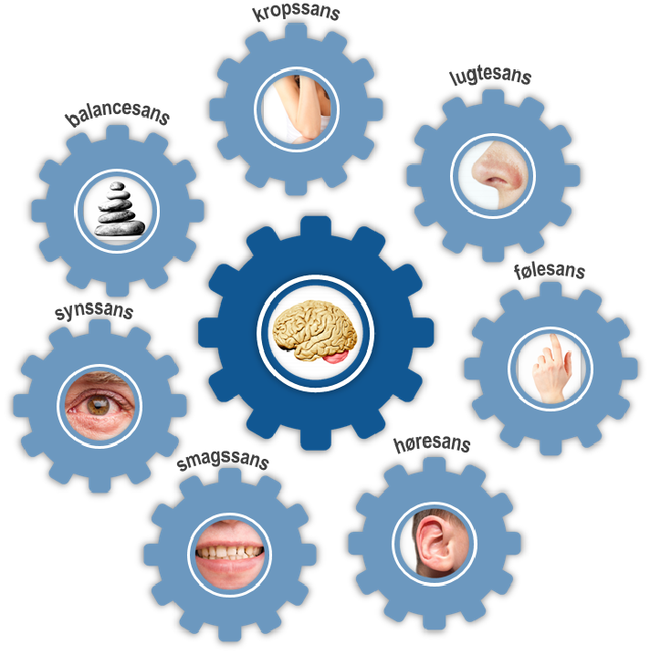 Billedet viser nogle af vores sanser, eksempelvis synssans, smagssans, høresans, følesans, lugtesans, kropssans og balancesans.