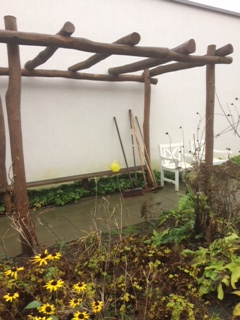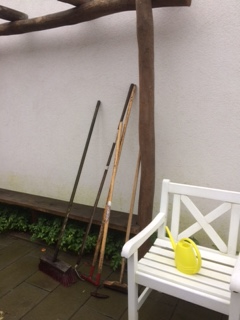Havearbejde, f.eks. trillebør, vandkande, kost, rive, hakke, grønne planter, potter