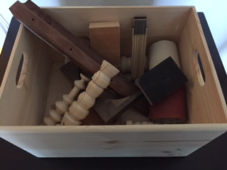 Træarbejde, f.eks. tommestok, træstykker, sandpapir, slibeklods, tømrerblyant