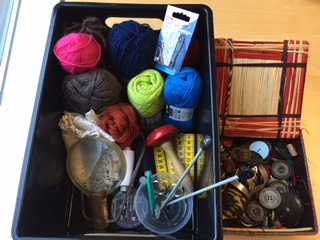 Sytøj, strikke, hækle, f.eks. garn, strikkepinde, nålepude, målebånd, opsprætter
