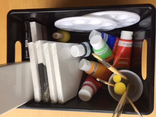 Malegrej, f.eks. tuber med maling, pensler, lærreder, blandepaletter